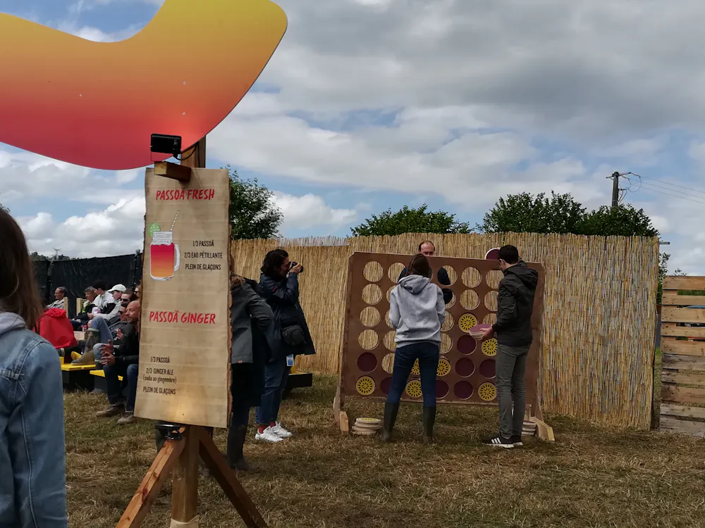 En 2019, Halloween Agency a donc imaginé un stand Passoa / bar de plage, conçu avec des matériaux éco-responsables en bois et palettes réutilisées, offrant une ambiance décontractée et ludique.